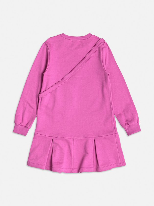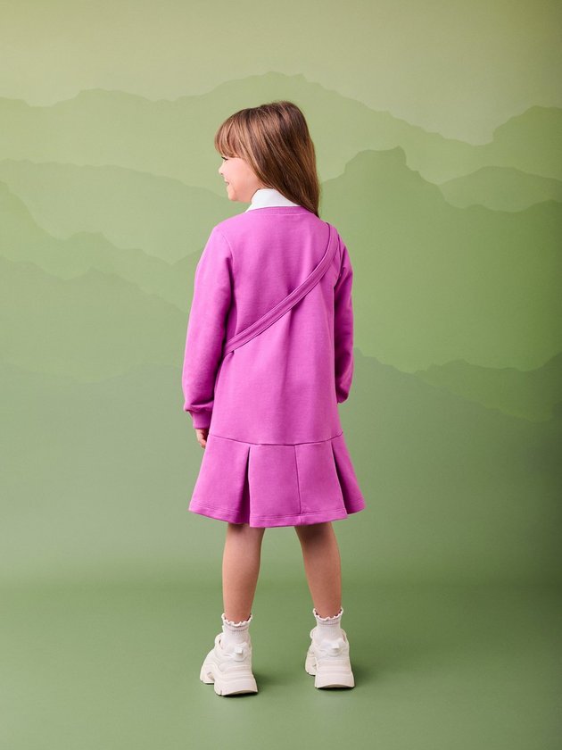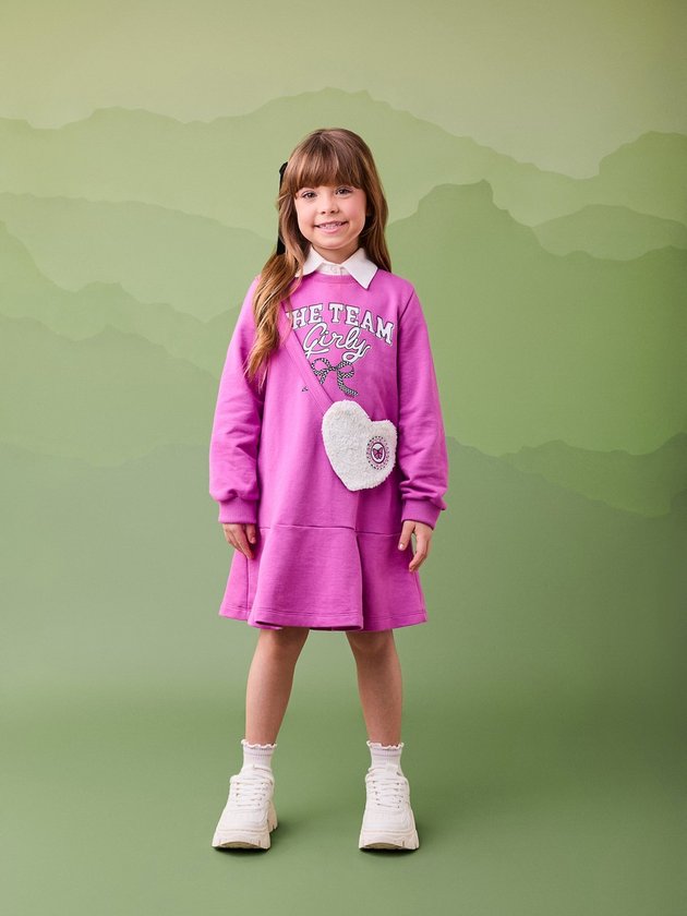 Um look para brilhar e conquistar corações! Esse vestido rosa da Momi traz a mensagem "The Team Girly" com aplicação de laço e detalhes que exalam estilo. Acompanha uma bolsinha de pelo em formato de coração, com alça transversal e patch de borboleta, que adiciona charme e praticidade ao visual. A saia com pregas dá movimento e um toque girl power à produção, ideal para as fashionistas mirins! *Não acompanha golinha. Ref.: H5972