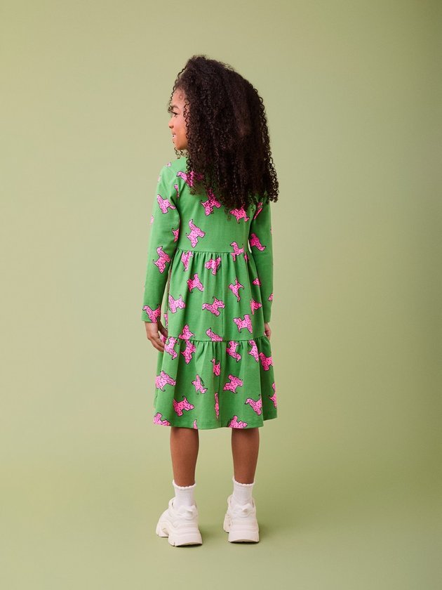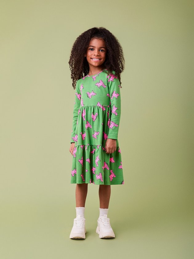 Este vestido, com mangas longas e estampa de cachorrinhos rosa sobre fundo verde vibrante, é pura diversão! O modelo de babados adiciona um toque fofo e cheio de movimento, perfeito para brincar com conforto e estilo. Ideal para ocasiões informais ou para um look descontraído no dia a dia, ele vai garantir que sua pequena arrase com muito charme e alegria.