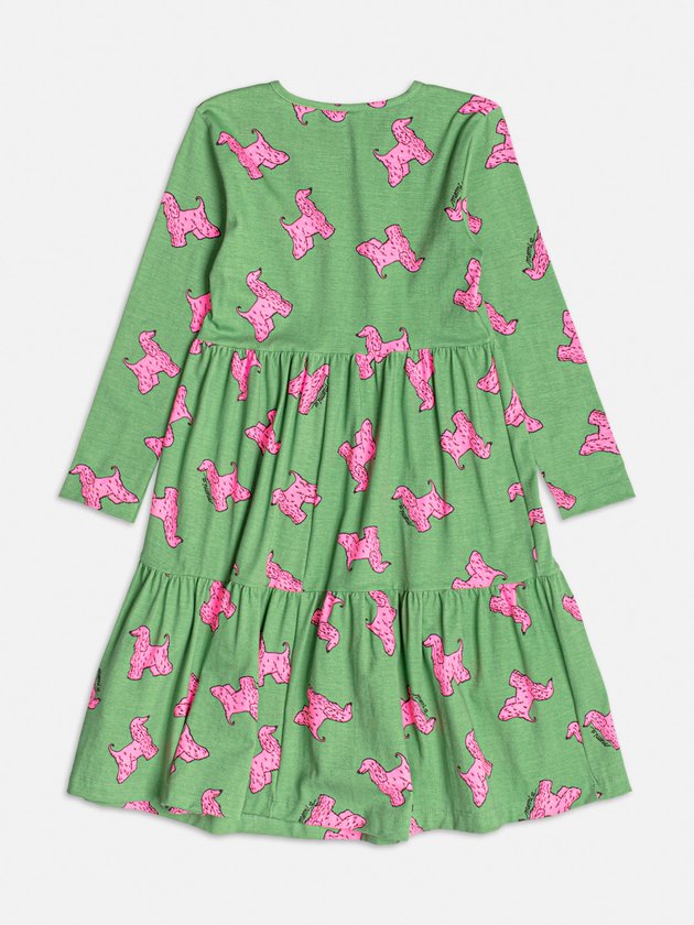 Este vestido, com mangas longas e estampa de cachorrinhos rosa sobre fundo verde vibrante, é pura diversão! O modelo de babados adiciona um toque fofo e cheio de movimento, perfeito para brincar com conforto e estilo. Ideal para ocasiões informais ou para um look descontraído no dia a dia, ele vai garantir que sua pequena arrase com muito charme e alegria. Ref.: H6221