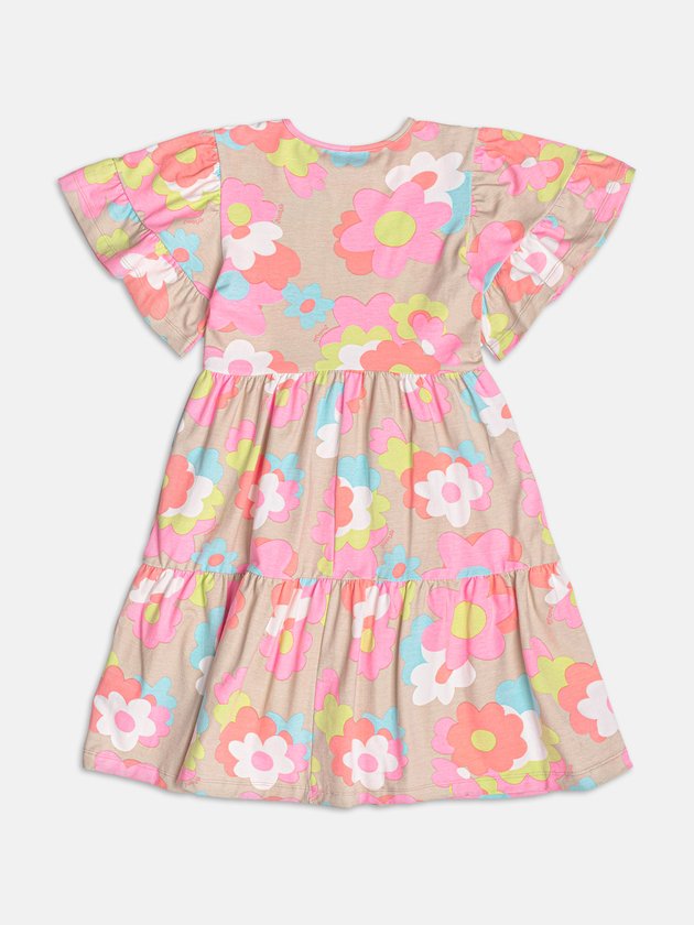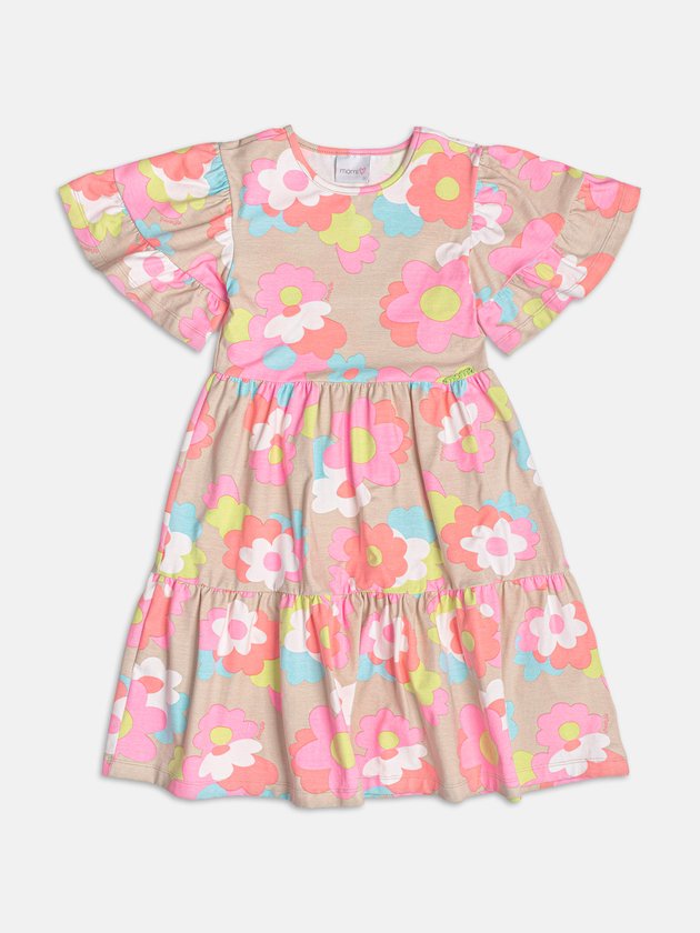 Este vestido é pura energia! Com flores estampadas em tons neon sobre fundo claro, a peça traduz a vibração solar da temporada. A modelagem com babado na barra deixa o look ainda mais divertido, ideal para brincar com estilo. Um verdadeiro jardim colorido para acompanhar os dias de sol.