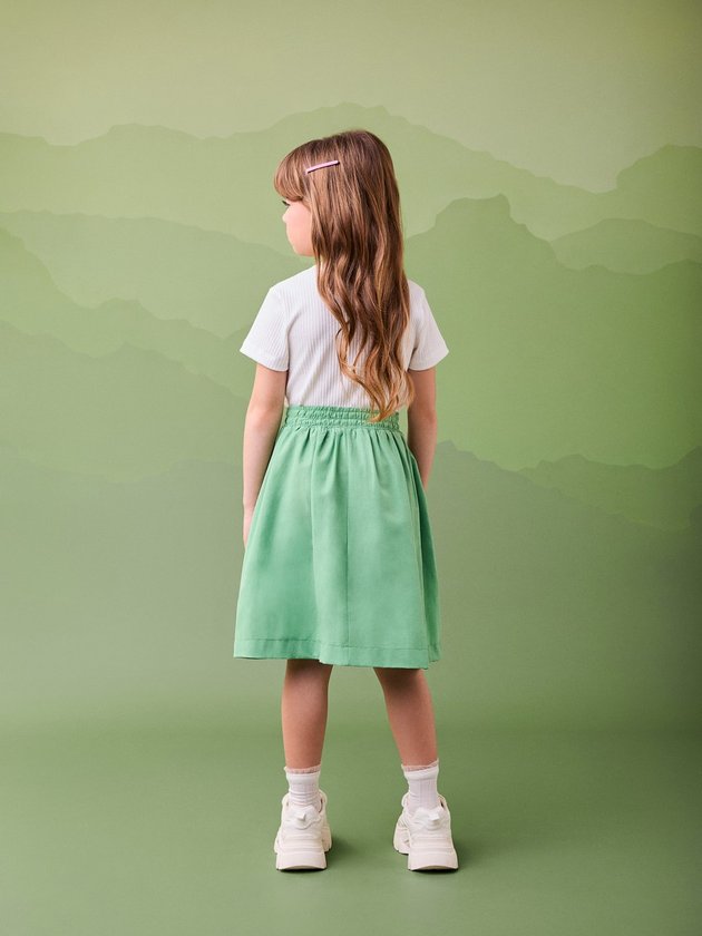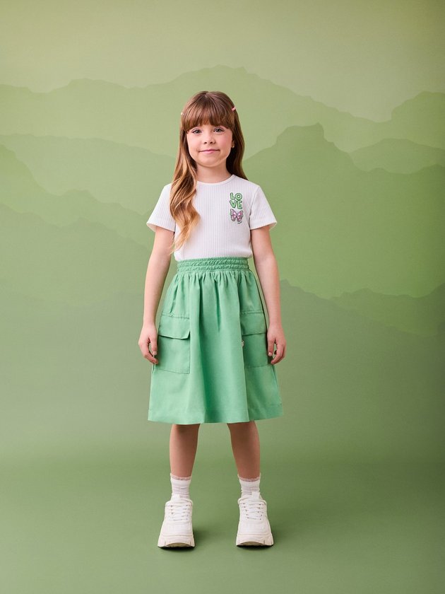 Para um visual moderno e cheio de personalidade! O vestido verde da Momi combina a delicadeza do top canelado com a proposta utilitária da saia verde com bolsos cargo. A cintura com elástico garante conforto e ajuste ideal ao corpo, enquanto o bordado LOVE com borboleta no peito adiciona um toque de charme e cor à peça. Um look estiloso e prático para acompanhar as pequenas em todos os momentos.