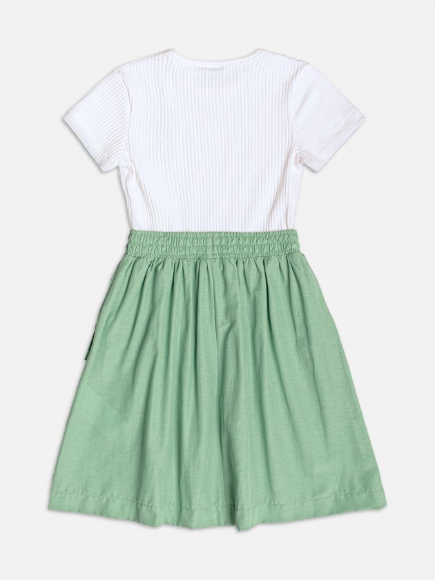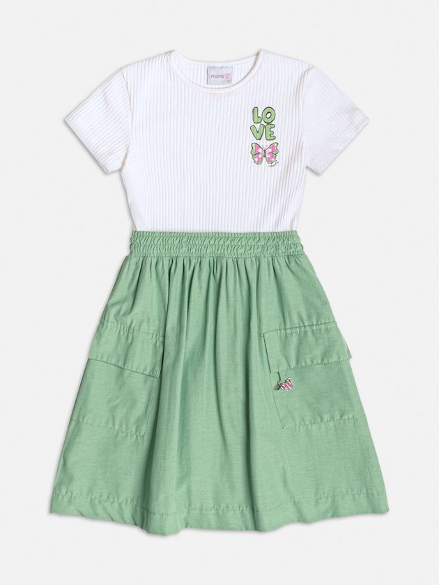 Este para um visual moderno e cheio de personalidade! O vestido verde da Momi combina a delicadeza do top canelado com a proposta utilitária da saia verde com bolsos cargo. A cintura com elástico garante conforto e ajuste ideal ao corpo, enquanto o bordado LOVE com borboleta no peito adiciona um toque de charme e cor à peça. Um look estiloso e prático para acompanhar as pequenas em todos os momentos. Ref.: H5964