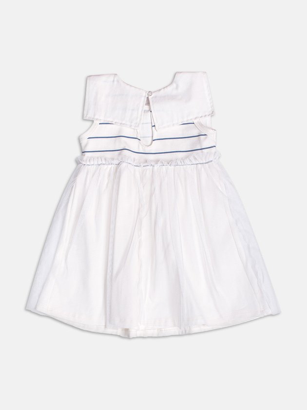 Com visual clássico e romântico, esse vestido off white ganha charme com a golinha estilo marinheiro e estampa de lacinho. A saia em tule levemente rodada garante leveza, enquanto os acabamentos finos elevam o visual. Ideal para eventos especiais ou para trazer um toque retrô ao dia a dia. Um look que une delicadeza e sofisticação com toque náutico.