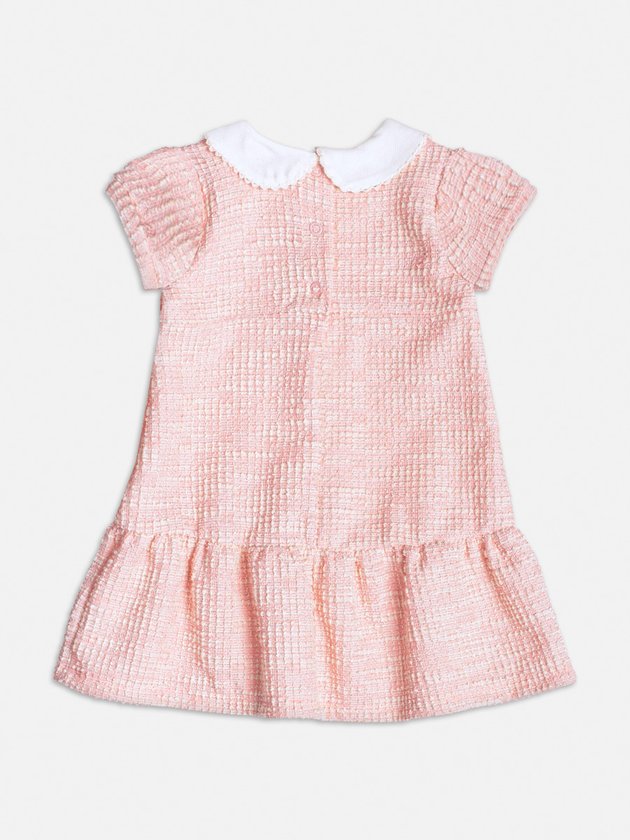 Com textura sofisticada de tweed, este vestido rosa ganha ainda mais charme com sua gola delicada. Uma peça ideal para eventos especiais e momentos elegantes.