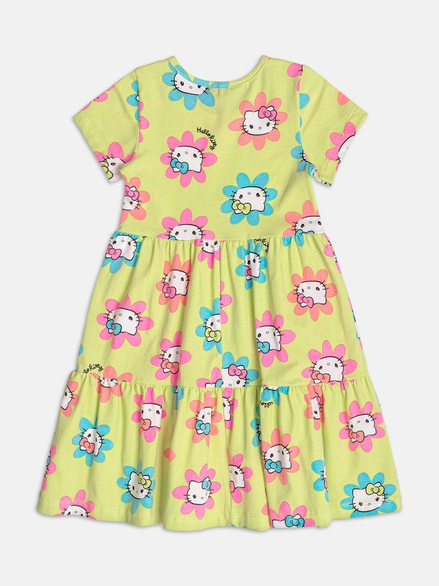 Este vestido traduz a essência tropical da coleção: em tom de verde melon super trendy, a peça é repleta de flores e rostinhos da Hello Kitty. A modelagem fluida e os babados delicados dão movimento ao look, criando um visual leve, alegre e cheio de personalidade.
