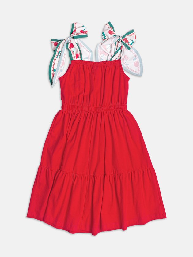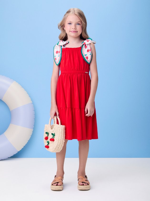 Em tom vibrante de vermelho, esse vestido traz uma estampa encantadora de cerejas e um laço no ombro, acompanhado de cerejinhas que adicionam feminilidade ao visual. A modelagem evasê valoriza o movimento da peça e garante conforto para brincar à vontade. Os detalhes delicados reforçam o estilo preppy, repaginado para os dias de sol. Um look alegre e cheio de charme para ocasiões especiais. Um clássico do verão com toque lúdico.
